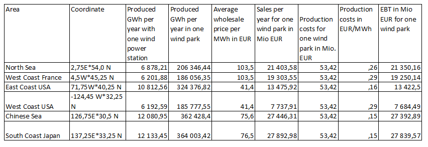 Total area of all rotor blades 15.700 square meter per wind power stations, this is equal to one onshore wind power systems with a diameter of 140 m